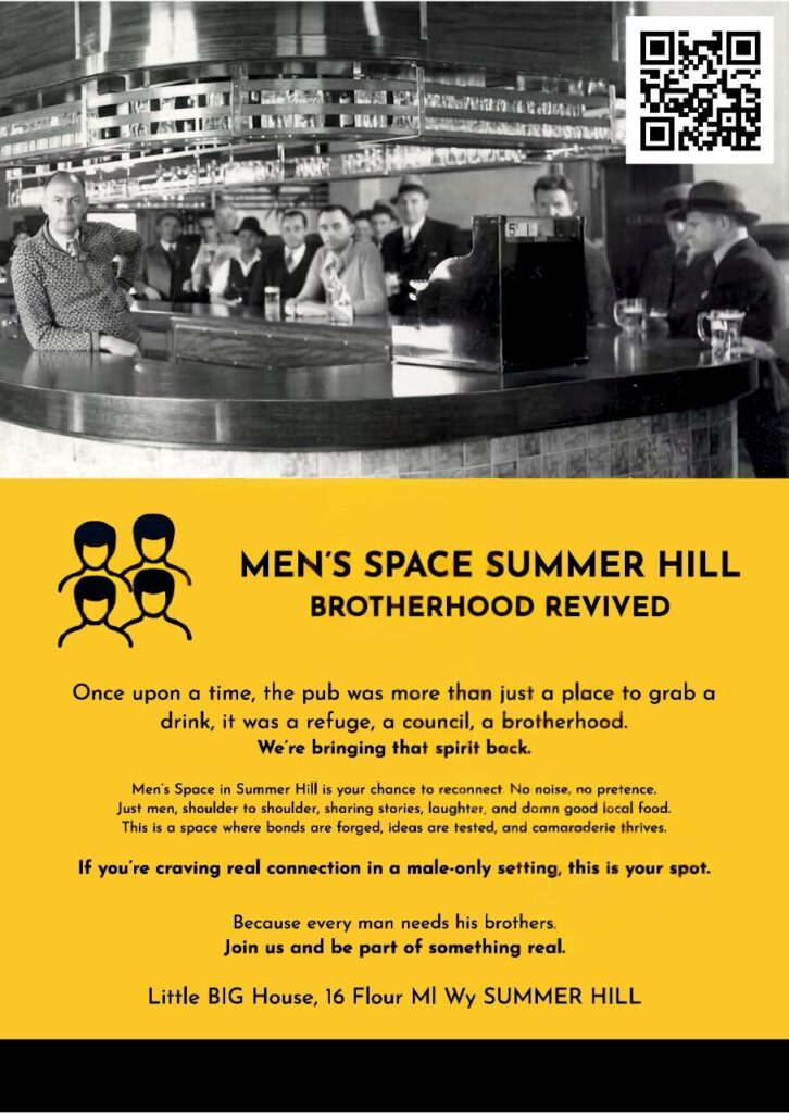 Once upon a time, the pub was more than just a place to grab a drink, it was a refuge, a council, a brotherhood. We’re bringing that spirit back. Men’s Space in Summer Hill is your chance to reconnect. No noise, no pretense. Just men, shoulder to shoulder, sharing stories, laughter, and damn good local food.